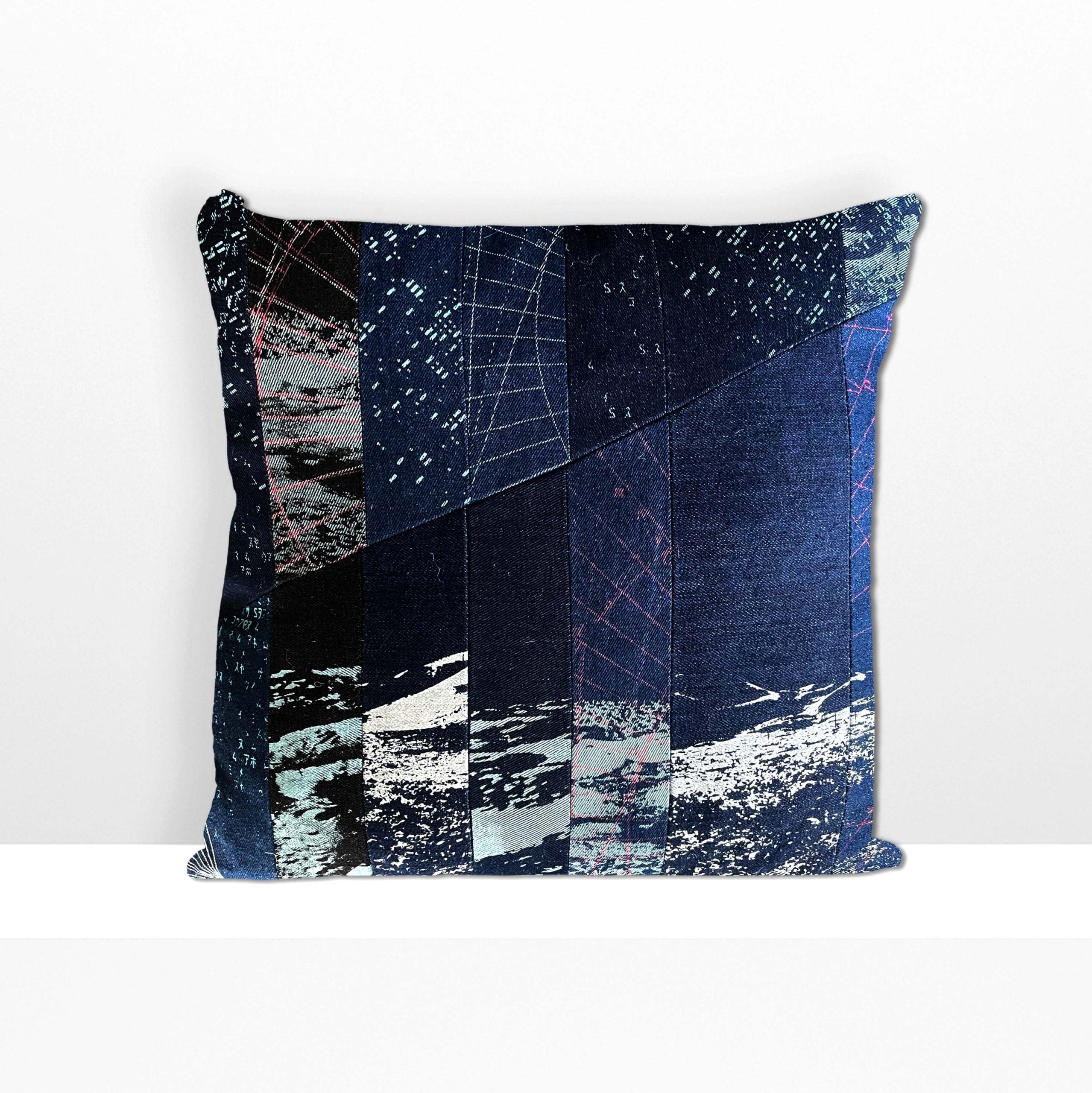 These cushions are part of MIN-studio’s Space Collection: layered images of the moon’s surface translated into screen-printed designs on durable denim. Printed with blue, grey, and neon pink inks, the multi-layered lunar textures create striking, slightly edgy, grunge-inspired abstract patterns. Perfect for living spaces or bedrooms, each cushion combines comfort with distinctive graphic design.