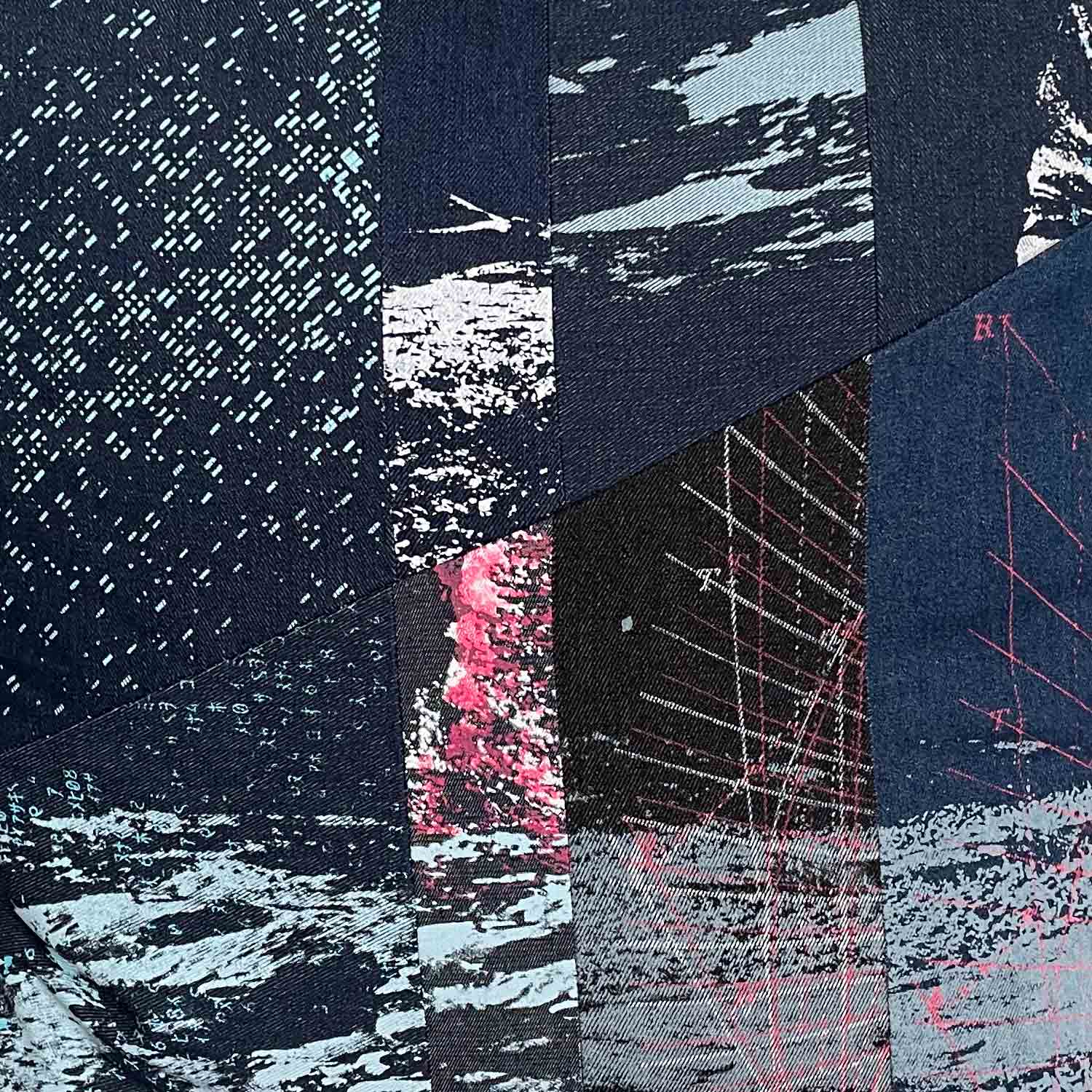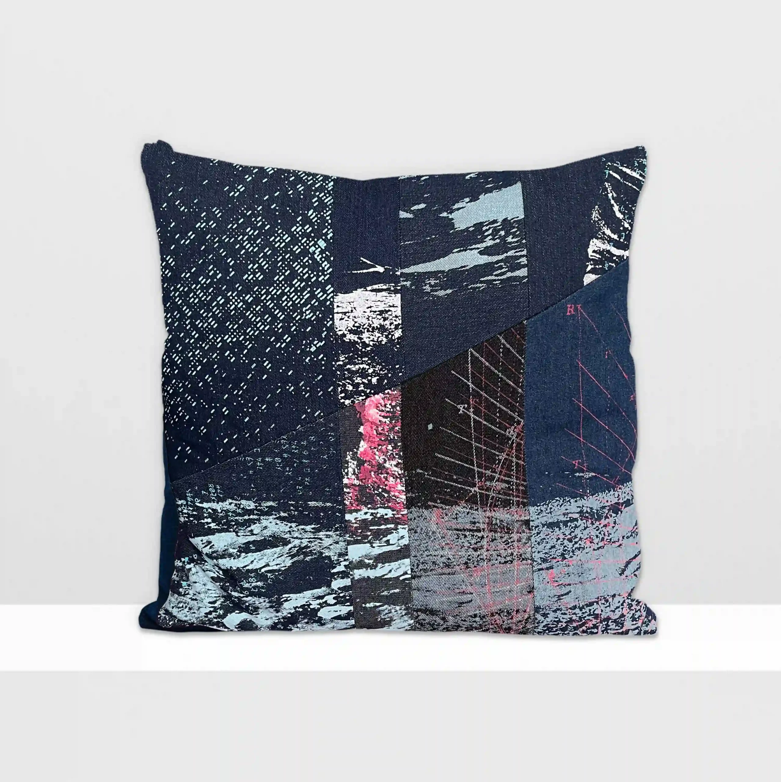The designs are applied using multi-layered screen-printing on deadstock denim, creating texture and depth with blue, grey, and neon pink inks. The combination of prints gives each cushion an edgy, grunge-inspired appearance. The printed fabric is then cut into pieces and sewn into a patchwork composition.