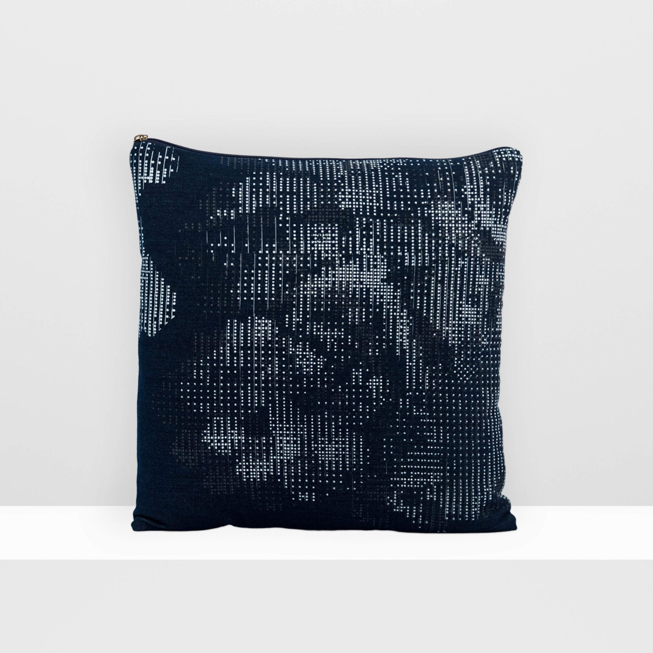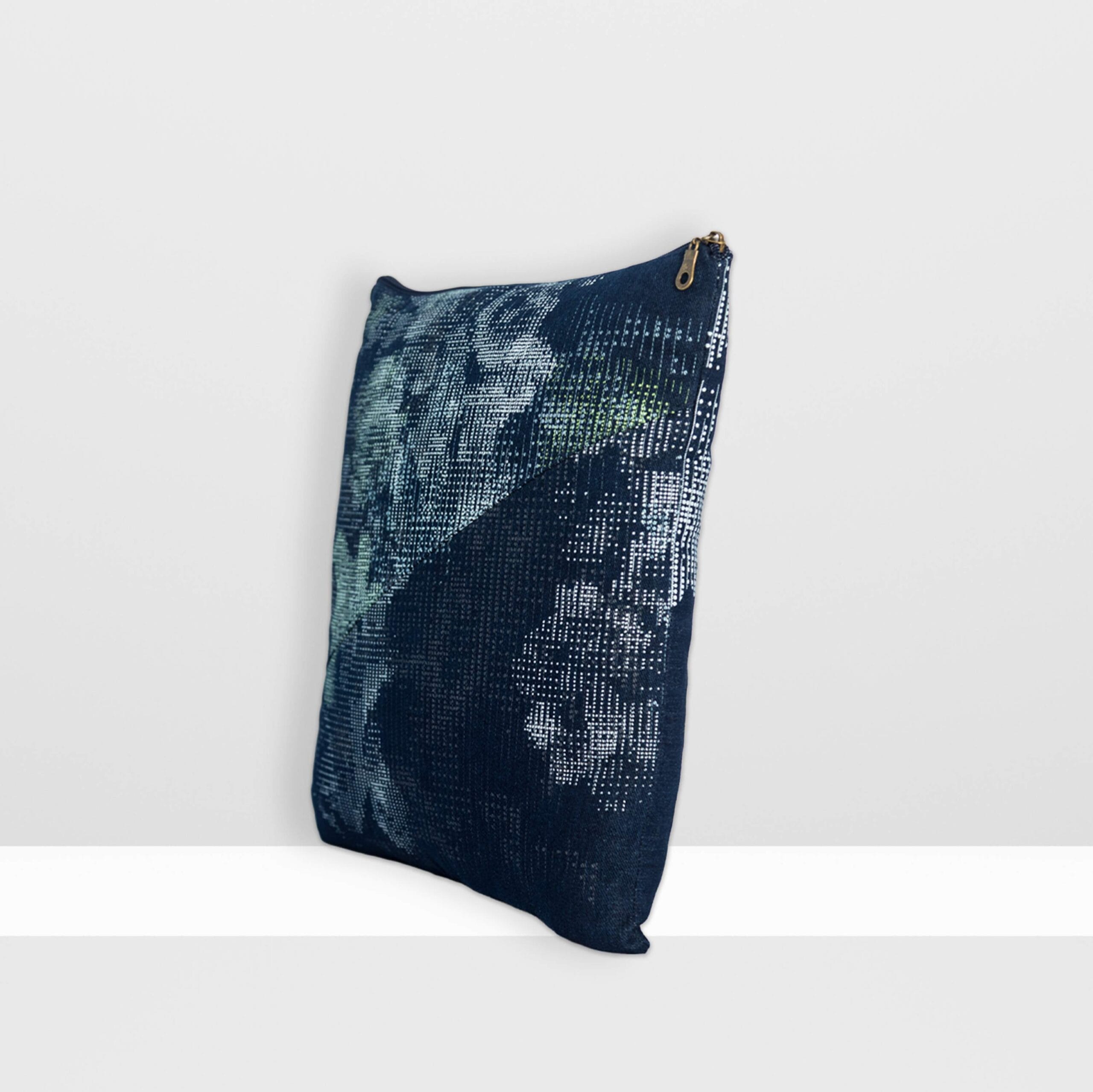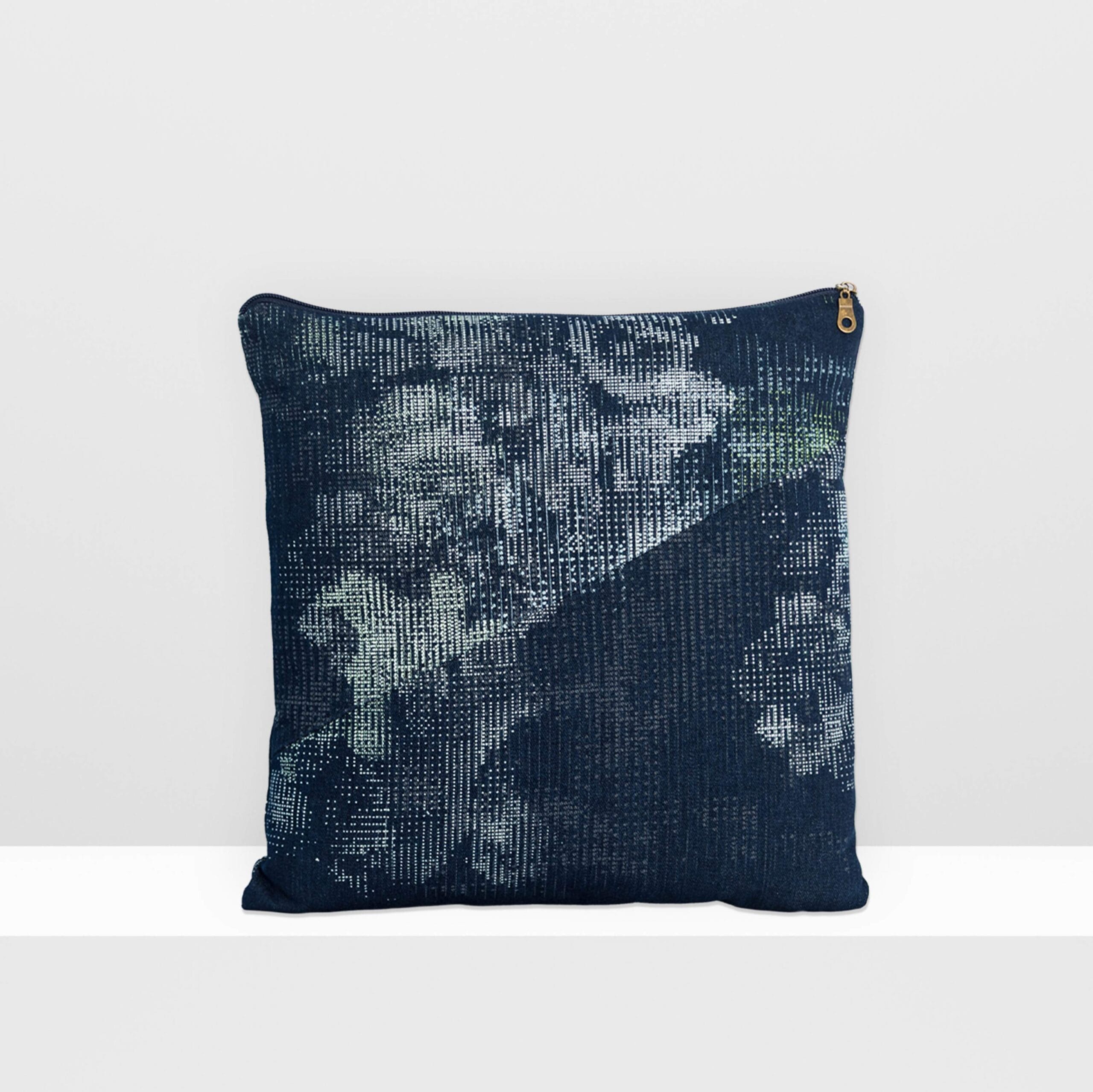 This medium sized decorative cushion from MIN Studio’s Digital Moss Collection features images of nature translated into minimalist digital patterns. Seen from afar, the original image is still recognizable, but up close it is reduced to lines and dots — the concept of Digital Moss. The designs are applied using multi-layered screen-printing on deadstock denim, creating abstract textures and moss-like patterns with blue, white, grey, and glow yellow inks. By applying layers of screen-print in a diverse, spread-out, non-logical way, the prints recreate the appearance of moss.