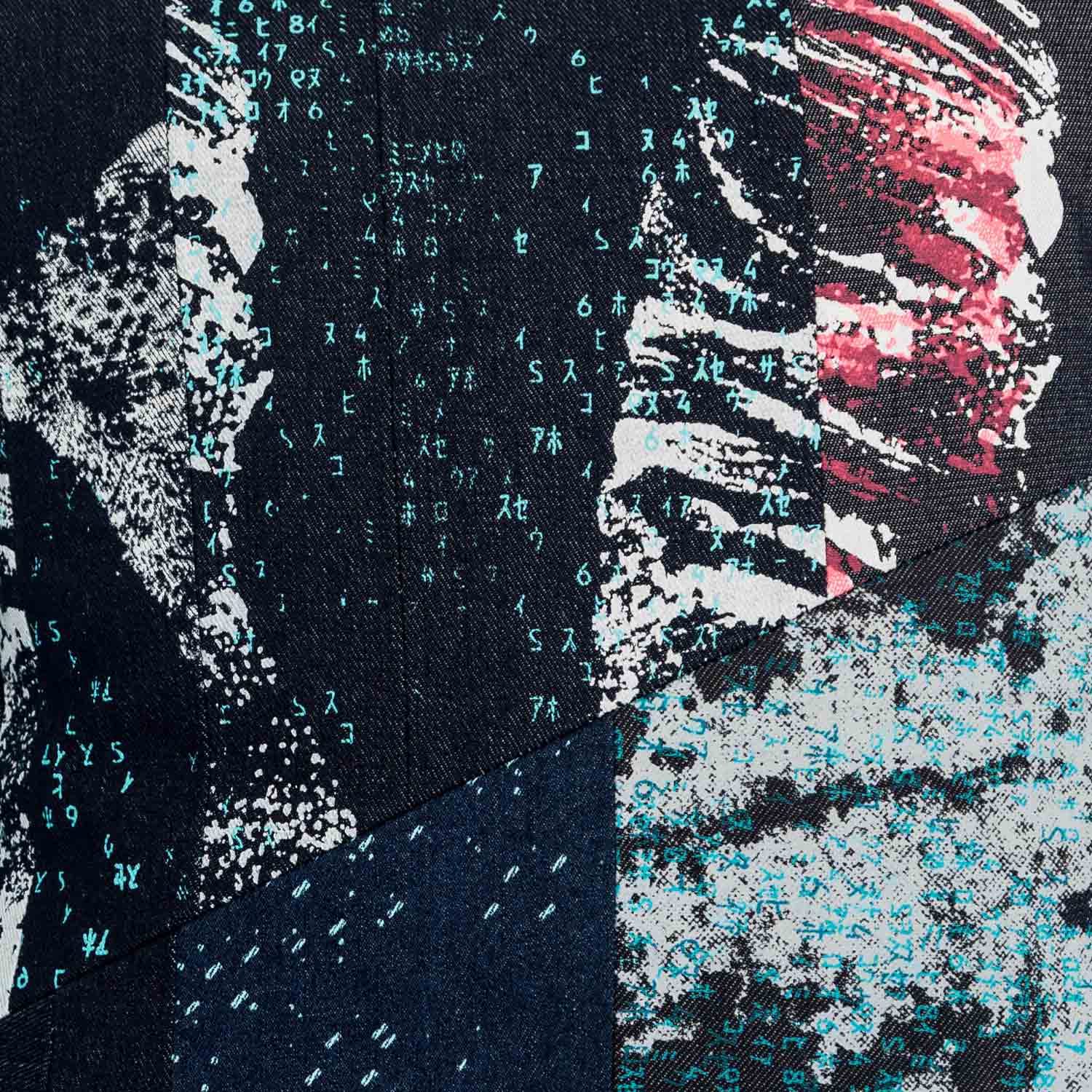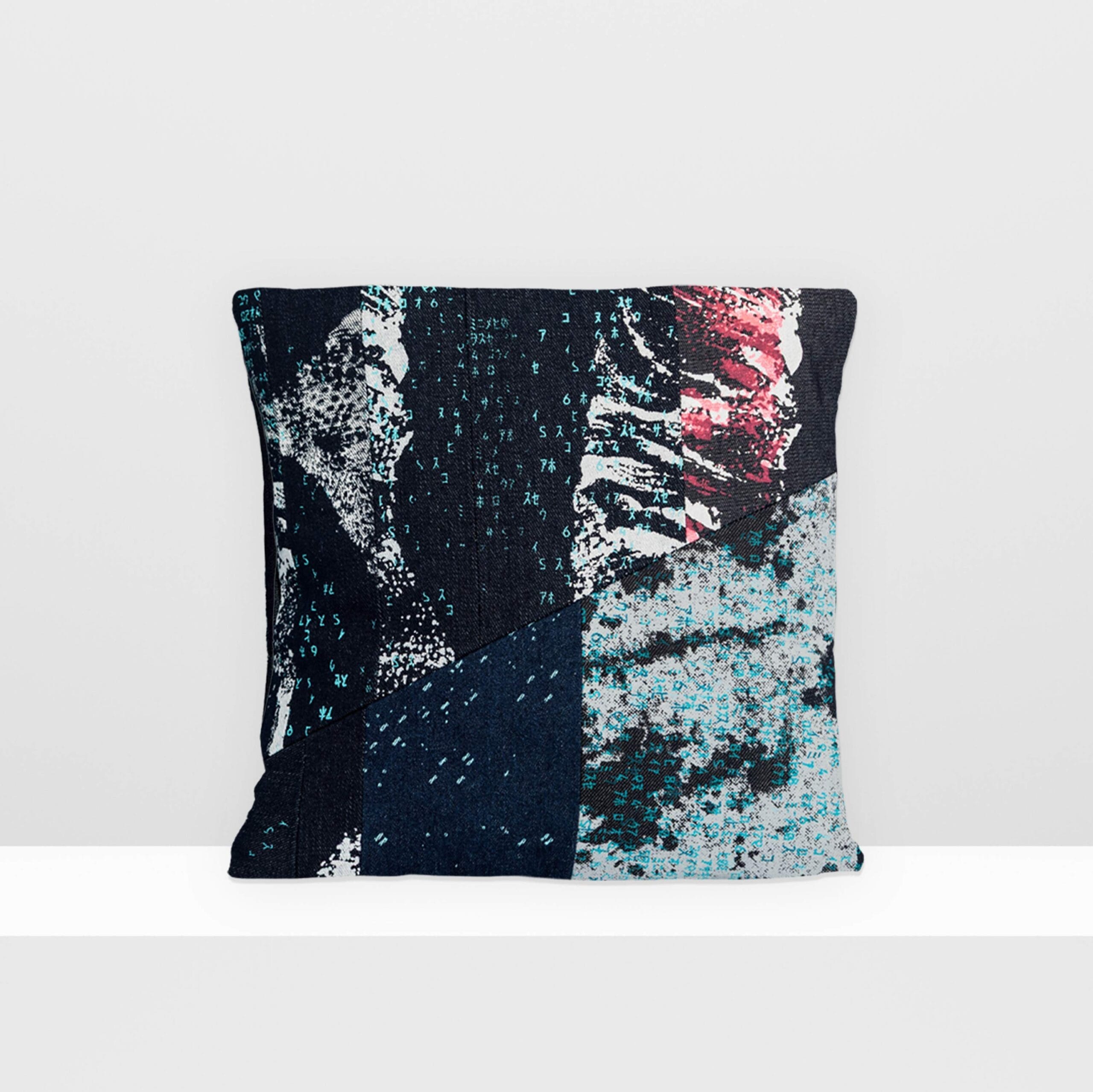 The designs are applied using multi-layered screen-printing on deadstock denim, creating texture and depth with blue, grey, and neon pink inks. The combination of prints gives each cushion an edgy, grunge-inspired appearance. The printed fabric is then cut into pieces and sewn into a patchwork composition.