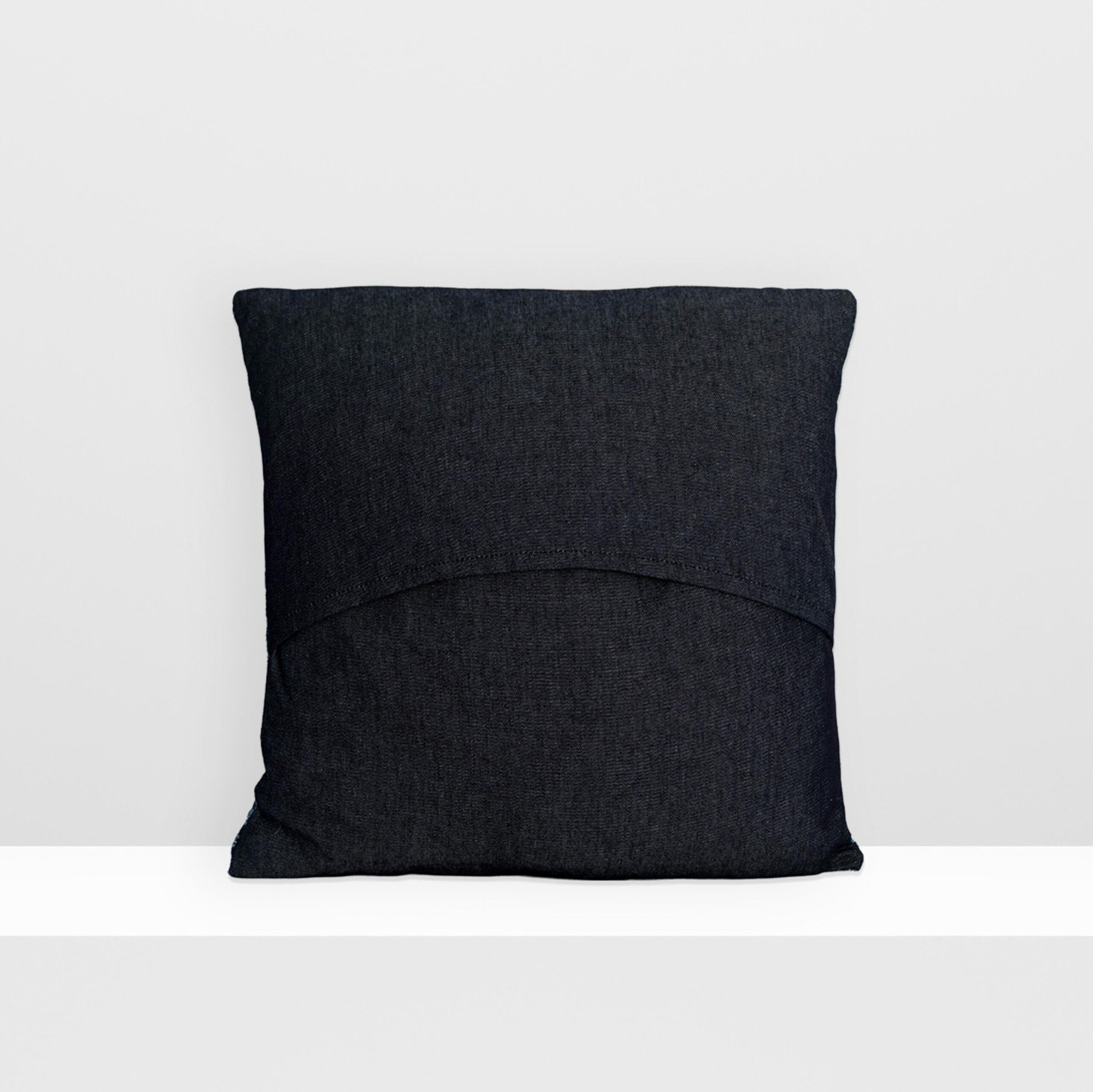 The back is finished with plain denim and a metal zipper. The cushion is filled with a sustainable feather filling. The finished cushion combines the printed designs and patchwork into a functional decorative pillow.