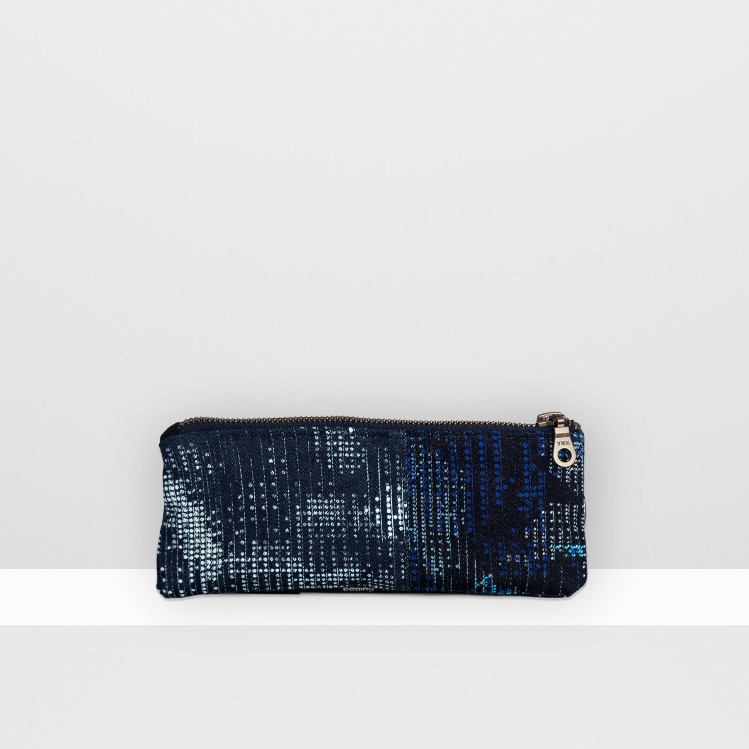 This pencil case is made from screen-printed Japanese recycled denim. The design is from the Digital Moss collection: images of nature translated into a minimalist digital pattern, then printed with multiple layers to create abstract textures and moss-like patterns. After printing with blue, white, grey and different tones of blue ink, the fabric is cut into pieces and sewn into a patchwork composition. The pencil case has a different, unique design on each side, a lining and a metal zipper.
